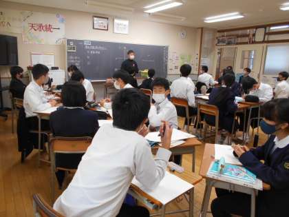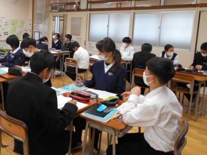 数学の授業では、基本の作図を身に付けるために、練習をしました。問題がクリアできると先生にスタンプを押してもらい、うれしそうでした。