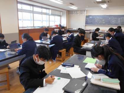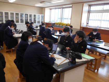 美術の授業では、オリジナル文様の制作を進めています。Chromebookでの情報を参考に、いかに簡素化して特徴を出すか考えました。