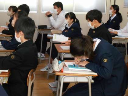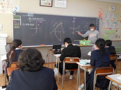 数学の授業では、基本の作図に取り組んでいます。三角定規やコンパスを使う理由も分かったようです。