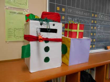 1年生の教室では、各クラス掲示物等を工夫していますが、クリスマスに合わせてデコレーションを作ったり、クラスメートにメッセージを入れる雪だるまのポストが設置されているクラスもありました。見ているだけでも、ほっとできるひとときです。