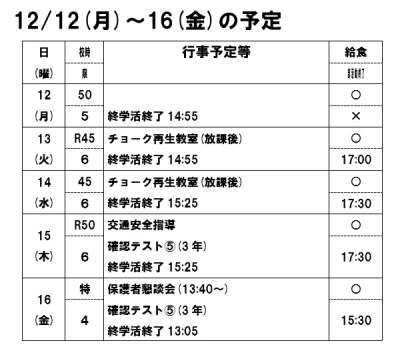 12月12日(月)〜16日(金)の予定