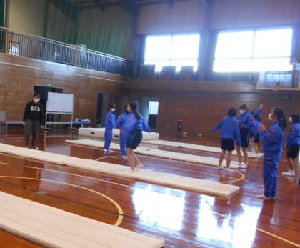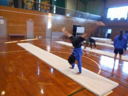 女子保健体育の授業では、マット運動に取り組んでいます。側転から両足で着地する技を、「ちょっと怖いな」と言いながらも思い切って練習できていました。