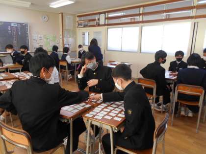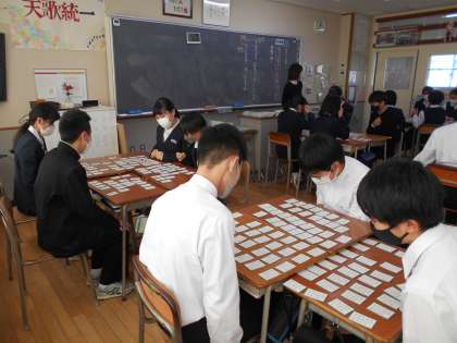 1年生で、来月予定されている百人一首大会の練習をしました。上の句で札を取れる強者もいたのでしょうか。