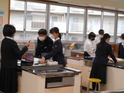 家庭科の授業では、エコバック作りの今日の作業を終え、後片付けをしているところでした。だいぶ進んだようです。