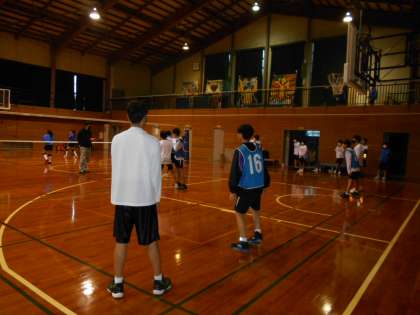 バスケットボール部は半面での練習でした。男子はコートで、女子はピロティーで活動しているところでした。