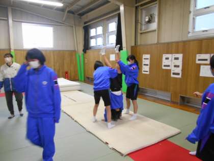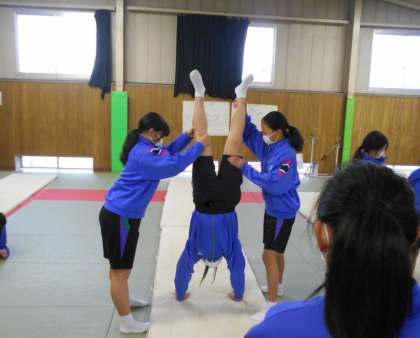 女子保健体育はマット運動でした。倒立の練習を、互いに支え合いながら進めました。サポートがあると安心してできました。