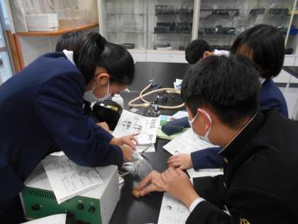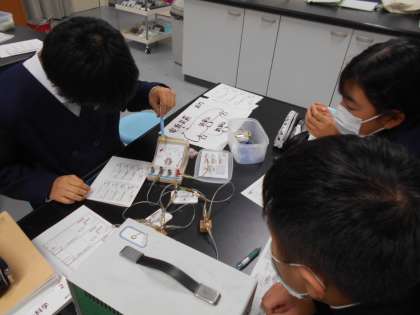 理科の授業では、直列回路と並列回路で、各部分の電圧にはどのような関係があるのか実験を通して考えました。
