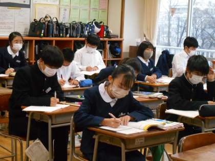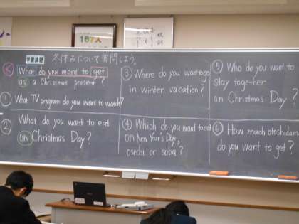 英語の授業では、グループごとに冬休みについて質問する文を作り発表しました。面白い質問がたくさん出てきました。
