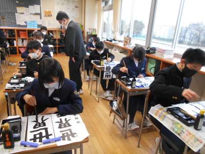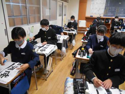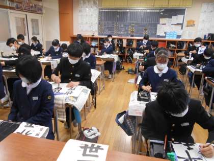 国語の授業では、書き初めの練習をしました。1年生は、今年度は「世界平和」と書きます。心の中で願いながら書きましょう。