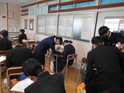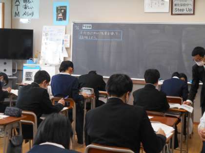数学の授業では、並行四辺形の性質を使った証明問題に取り組みました。つまずいたところは教え合いながら進めていました。