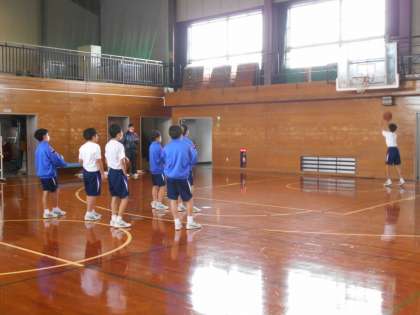 男子保健体育では、決められた時間内に、よりたくさんシュートを決められるように頑張りました。前回よりシュート数は増えたでしょうか。