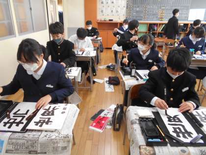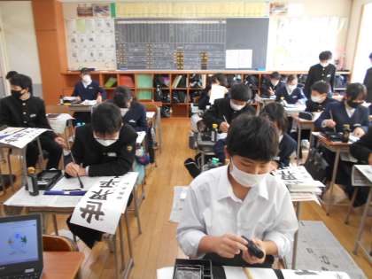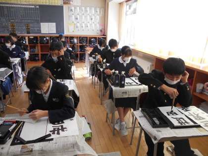 国語の授業では、書き初めの練習をしました。中心を意識して、筆を立てて書くことを心がけました。