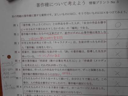 技術の授業では、著作権について勉強しました。クイズ形式で進められましたが、ワークシートに解説されたポイントをメモしていることに感心しました。