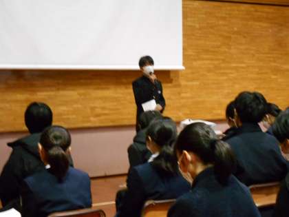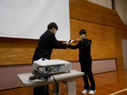 学年生徒会に続き、書記会、班長会の代表生徒からも、それぞれの取組の成果と課題、そして、3学期の取組予定が報告されました。それぞれに、ねらいを定めて考えて実践した取組がたくさんあり、成果も大きかったようです。班長会からは、提出物強化週間の優秀クラスの表彰もありました。
