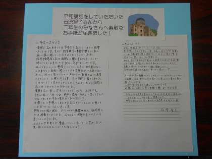 11月29日に平和講話をしていただいた石原智子さんから、二年生のみなさん宛てに素敵なお手紙が届きました。学年集会でもその一部を紹介したのですが、2年生の様子から、「南中プライド」が石原さんにも伝わったようで、うれしく感じました。