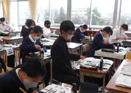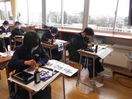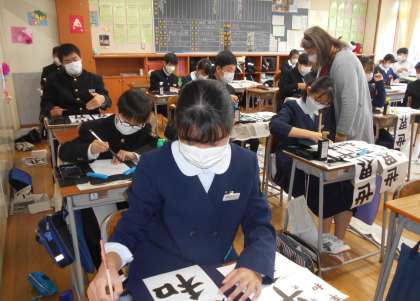 1年生は「世界平和」と書きます。一文字一文字丁寧に、楷書で書きました。中心がずれたことに気付き、2回目は気を付けようという声も聞かれました。