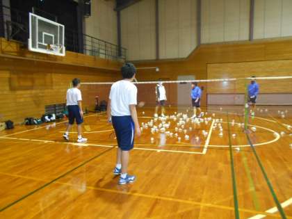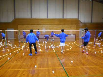 男子バドミントン部の様子です。各コートに分かれてシャトルを打ち、レシーブの練習です。