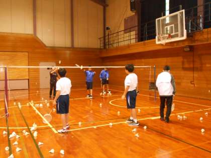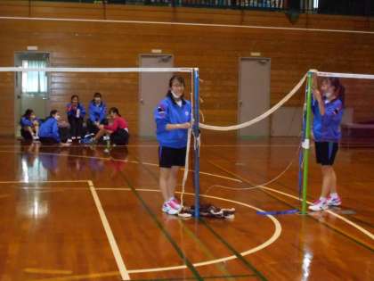 女子バドミントン部は、ちょうど休憩の時間でしたが、コートとコートの間にもネットを張り、後半の練習の準備をしている人もいました。