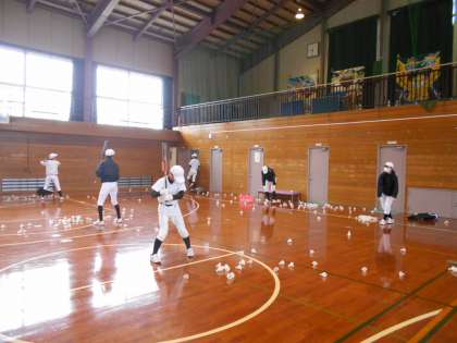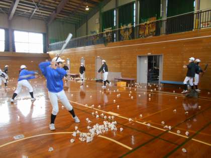 野球部は体育館の半分を使って、バッティング練習をしました。年明け1回目の練習に、みんな元気に取り組みました。今年も頑張ります。