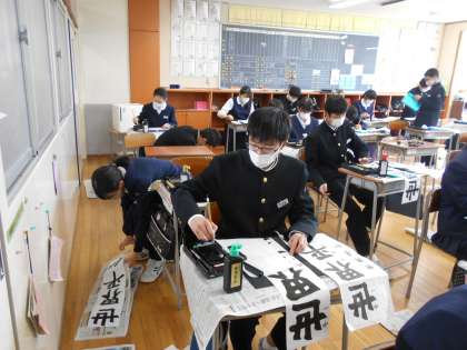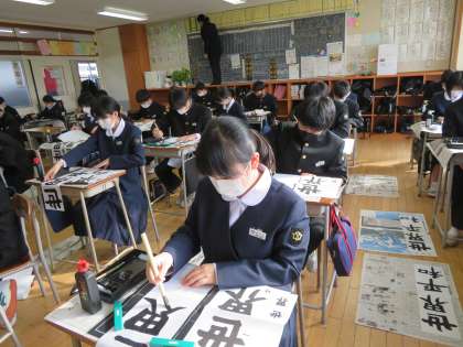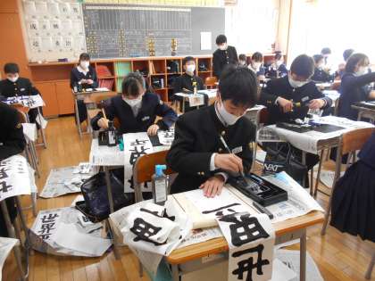 1学年の書き初めの課題は、「世界平和」でした。新年の始まりにふさわしく、生徒たちは、心を落ち着けて丁寧に筆を走らせていました。
