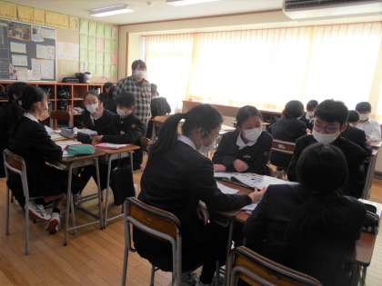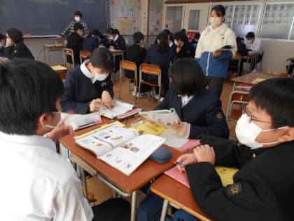 英語の授業では、班ごとに本文を読む練習をしました。発表時の目標は45秒。30秒以内の班はボーナス点が出るようです。みんなクリアできるように練習に取り組みました。