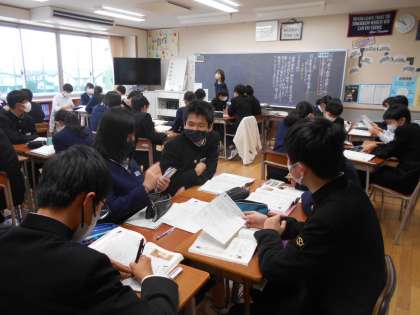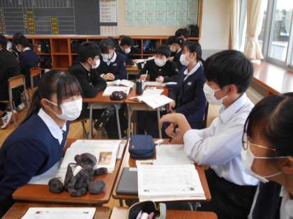国語の授業では、評論文「君は『最後の晩餐』を知っているか」の内容を捉えられるように、班内で自分の考えを発表し合いました。