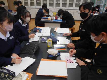 美術の授業では、多くの人の手にとってもらえるようなオリジナルパック作りを進めています。アイディアは一つとして同じものはなく、個性が出ていて面白いものでした。