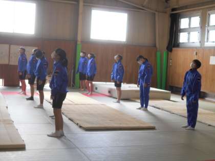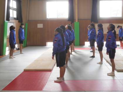 女子保健体育の授業はマット運動でした。始める前には、けがをしないように準備体操から始めました。
