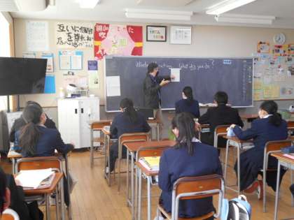英語の授業では、冬休みにしたことについて、楽しかったこと、何を食べたかなど、いろいろな質問に答えながら英文で表現しました。