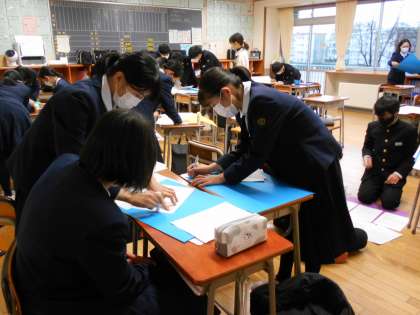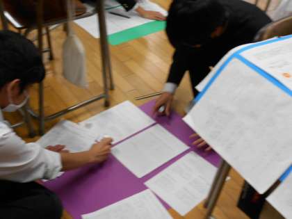 平和課題学習のクラス発表会を終え、今日の放課後は、一人一人のレポートを掲示するため、修学旅行実行委員の生徒が、テーマ別にレポートを貼る作業をしてくれました。タイトルを付けたり、レイアウトを考えたりしながらも、手際よく進めていました。