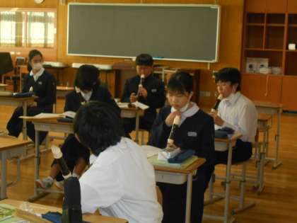 音楽の授業では、アルトリコーダーでリレーをしました。一人が演奏終わったら次の人へと、上手にリレーできました。