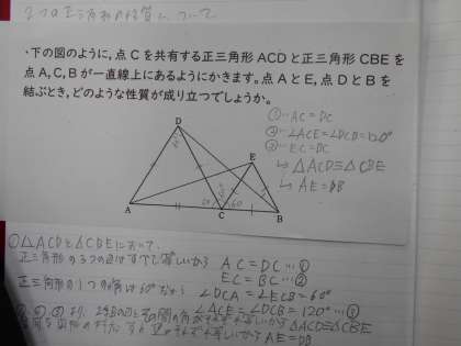 数学の授業では、2つの正三角形の性質を考えました。どんな性質があったのでしょうか。お子様に質問していただくのもよいかもしれません。