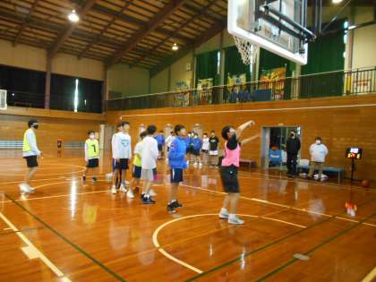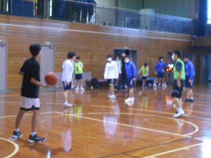 男子バスケットボール部の様子です。コーチの指導を受けながら、動き、立ち位置を意識して練習をしました。
