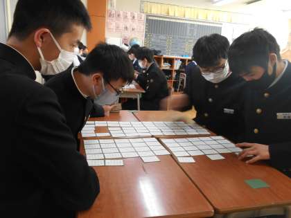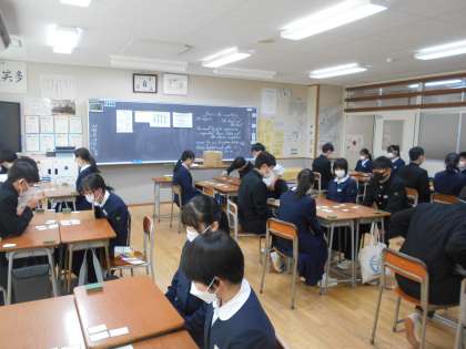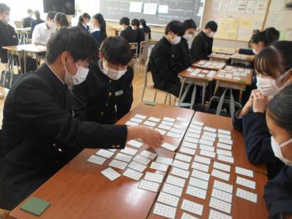 中学校最後の百人一首大会が行われました。文化委員を中心に進められ、どのグループも白熱した戦いとなりました。集中力を切らすことなく、一枚でも多く札を取ろうと手を伸ばす姿からは、楽しさが伝わってきました。3年生にとって、良い思い出になったと思います。