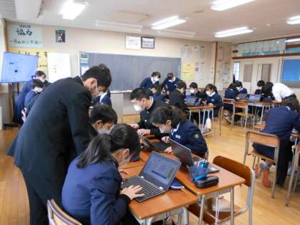 学活の時間は、来年度の修学旅行に向けて京都タクシー班別学習の事前学習を行いました。冬休みに一人一人が作成した京都に関するスライドを参考にしながら、個人課題を考えました。今後は、課題に合わせて見学地を決定していきます。分からないところは教え合い、協力して進めていました。