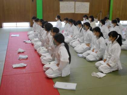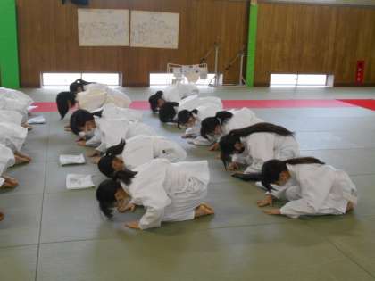 女子保健体育の授業は柔道でした。座り方、手の位置、お辞儀の仕方等、礼法から練習をしました。