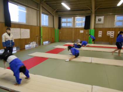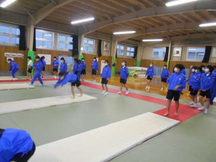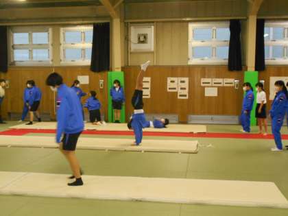 女子保健体育の授業では、マット運動に取り組みました。倒立、開脚前転、ブリッジ。みんな果敢に挑戦していました。すばらしいです。