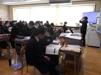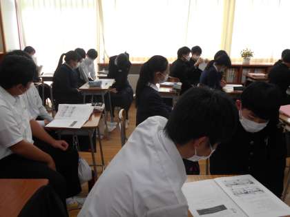 英語の授業では、本文の内容を確認した後、確認テストの振り返りをしました。長文を読むときのこつや英作文で気を付けるところを確認しました。