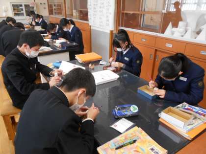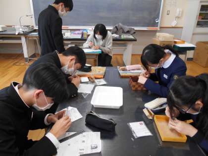 美術の授業で制作している篆刻の様子です。早く進んだ人は、試しに朱肉を付けて押印してみました。うまくできていました。