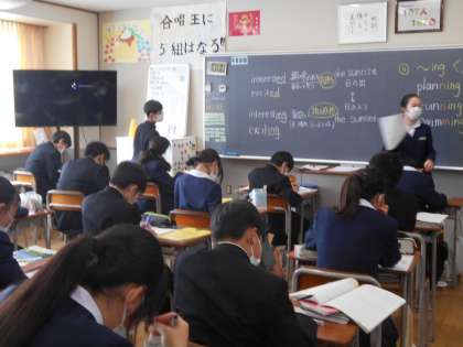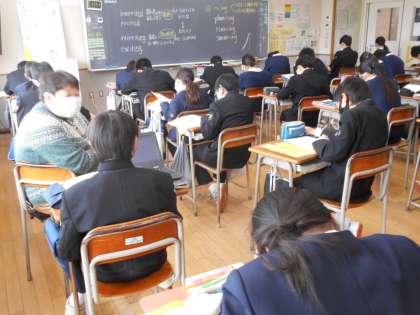 英語の授業では、これまでの復習をワークシートで進め、できた人から答合わせをしたり、分からないところは先生に質問したりして取り組んでいました。