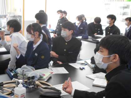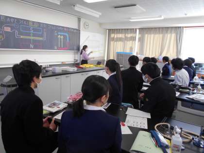 理科の授業では、磁界の中でコイルに電流を流す実験をしました。右手を使って、その向きを覚えることも教えてもらいました。
