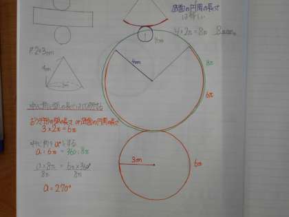 数学の授業では、円錐の展開図を書くことに取り組みました。ノートには分かりやすくしっかりまとめられており、感心しました。