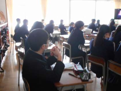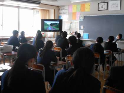 社会の授業では、これまで学習した地方財政について、宇奈月の温泉を題材にした視聴覚教材を使って具体的に考えました。
