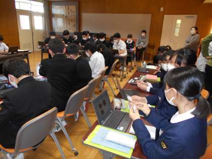 代議員会の様子です。これまでの振り返りもしましたが、この後に予定されている福祉ボランティア活動の説明もありました。全校で折り紙の創作活動を行い、福祉施設に寄贈する予定です。やり方の動画を見て、代議員もやってみました。みなさんに喜んでもらえるものになるように心を込めて折りましょう。