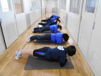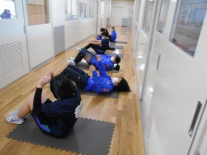 ソフトボール部は、校舎内で腹筋や体幹のトレーニングをしました。