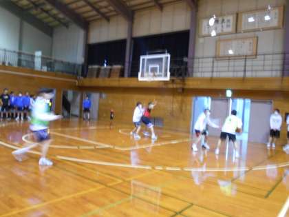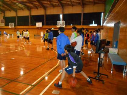 男子バスケットボール部は、交代でコートに入り、コーチの指導を受けて練習しました。