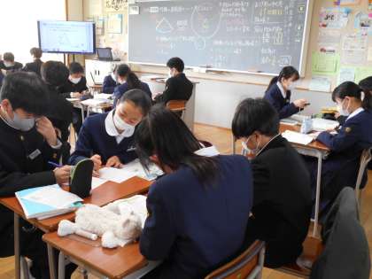 数学の授業では、円錐の展開図について、グループで課題を解きました。理解は進んだでしょうか。