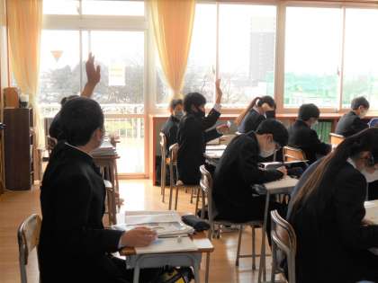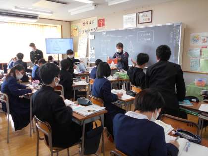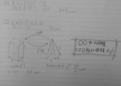 数学は、立体の体積を求める授業でした。水を使っての実験もあり、課題を解くためのイメージをつかみやすかったのではないでしょうか。