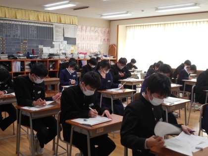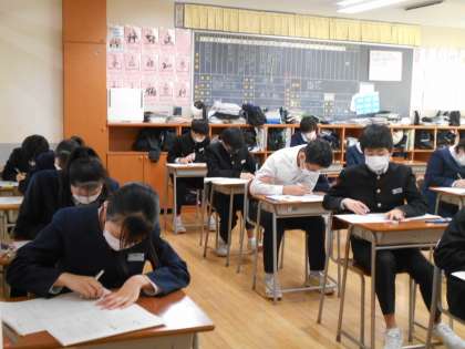 3年生にとっては最後の定期評価です。最近新しく習った範囲もあると思いますが、これまでの復習となる問題も多いと思います。県立一般選抜に向けての練習、また、3年間の振り返りと考えて、問題に真摯に向き合いましょう。