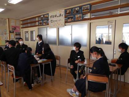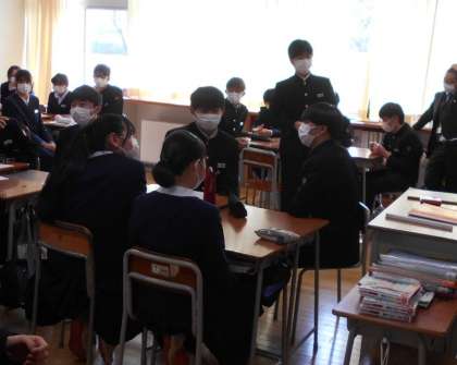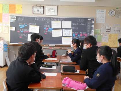 社会の授業では、食品ロスを解消するために、学校給食はどうするべきか意見を出し合っていました。